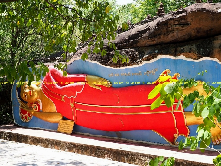 เดินไปไม่ไกลก็จะเห็นพระพุทธไสยาสน์พุทธมหามงคล สีแดงสดเด่นเป็นสง่าอยู่ทางพุ่มไม้ซ้ายมือ